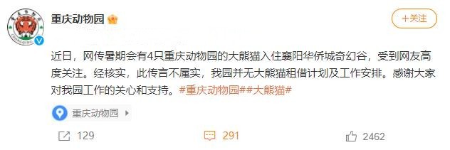經核實,此傳言不屬實,重慶動物園并無大熊貓租借計劃及工作安排。