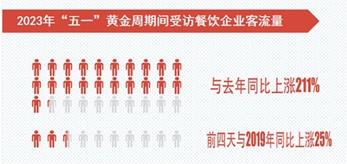 “五一”黃金周期間,受訪餐飲企業(yè)營(yíng)業(yè)收入比去年同期上漲149%,客流量同比去年上漲211%;今年“五一”前四天營(yíng)業(yè)收入比2019年“五一”上漲26%,客流量比2019年“五一”上漲25%。