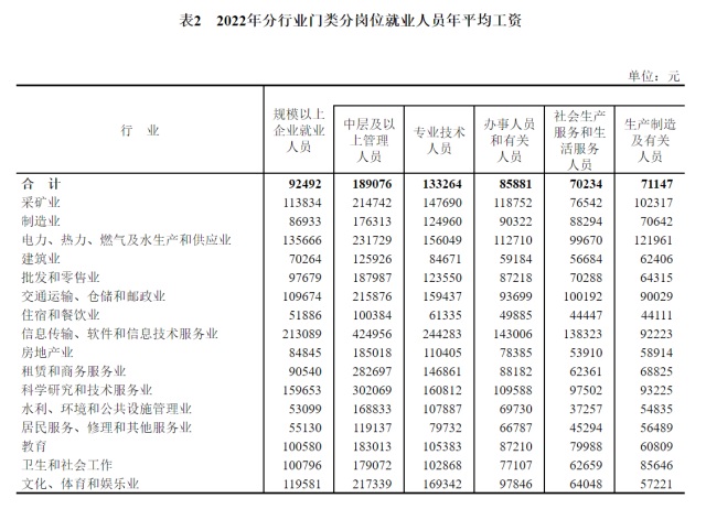 2022年分行業(yè)門類分崗位就業(yè)人員年平均工資。來源:國家統(tǒng)計局