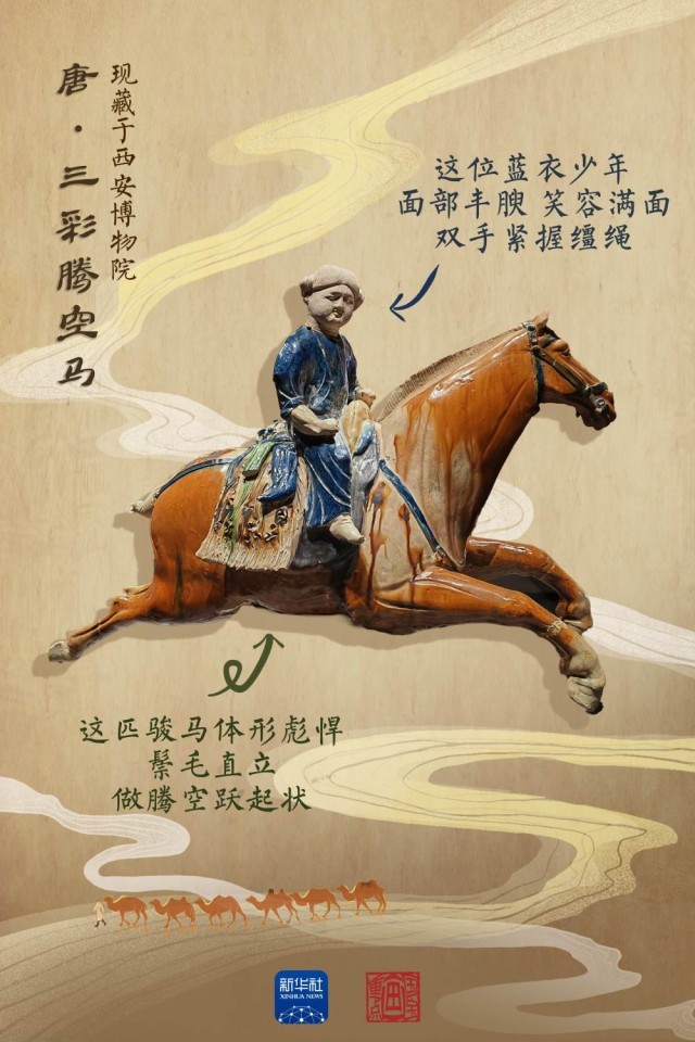 1000多年前,一位來(lái)自西域的“藍(lán)衣少年”,穿過(guò)茫茫戈壁、廣袤沙漠,抵達(dá)長(zhǎng)安。這位“藍(lán)衣少年”,是西安博物院“明星”藏品——唐代三彩騰空馬之上的騎手。“他”,也見(jiàn)證了這場(chǎng)跨越千年的文明交融。
