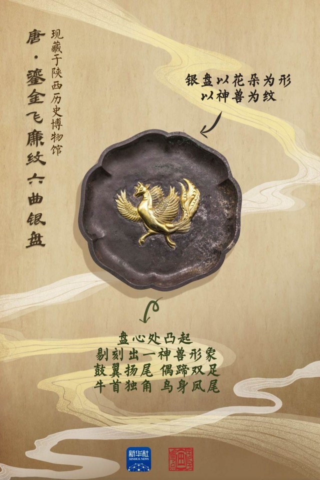 1970年10月,在西安市南郊何家村的工地上,施工人員偶然發(fā)現(xiàn)了一處文物窖藏,隨后在這里清理出千余件唐代珍寶。這件鎏金飛廉紋六曲銀盤制作考究、工藝典雅、紋飾獨(dú)特,盤心的神獸形象為飛廉,是中國(guó)古代神話傳說(shuō)中的風(fēng)神。這件銀盤構(gòu)圖借鑒了中亞粟特的藝術(shù)手法,但題材卻是中國(guó)紋樣,反映出唐代工匠在借鑒西方金銀器藝術(shù)的基礎(chǔ)上,更加注重推陳出新。