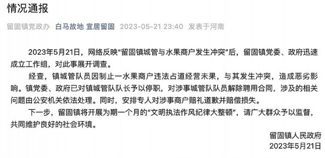 城管與水果商戶沖突?河南留固鎮(zhèn):涉事城管隊(duì)隊(duì)長停職、隊(duì)員解除合同