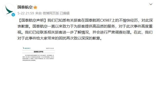 22日晚,國泰航空發(fā)聲明稱,已知悉有關旅客在CX987航班上的不愉快經歷,公司對此深表歉意,并聯(lián)系相關旅客進一步了解情況,會進行嚴肅調查處理。
