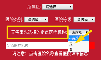 進(jìn)入頁(yè)面后,點(diǎn)擊“無需事先選擇的定點(diǎn)醫(yī)療機(jī)構(gòu)”選項(xiàng),選擇“是”。
