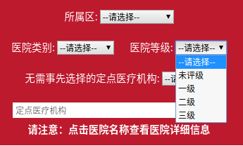同時(shí)可選擇所屬區(qū)、醫(yī)院類別(定點(diǎn)中醫(yī)醫(yī)院、定點(diǎn)專科醫(yī)院、對(duì)外綜合等醫(yī)院等)、醫(yī)院等級(jí),或輸入定點(diǎn)醫(yī)院名稱進(jìn)行詳細(xì)查詢。