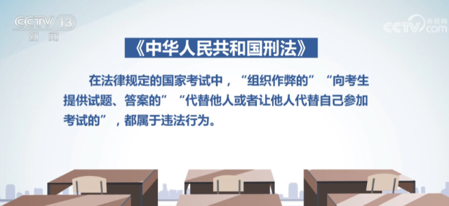 《中華人民共和國(guó)刑法》規(guī)定,在法律規(guī)定的國(guó)家考試中“組織作弊的”“向考生提供試題、答案的”“代替他人或者讓他人代替自己參加考試的”,都屬于違法行為?!蹲罡呷嗣穹ㄔ?、最高人民檢察院關(guān)于辦理組織考試作弊等刑事案件適用法律若干問(wèn)題的解釋》明確,對(duì)在高考等國(guó)家教育考試中組織作弊的,將直接認(rèn)定為“情節(jié)嚴(yán)重”行為,處三年以上七年以下有期徒刑并處罰金。