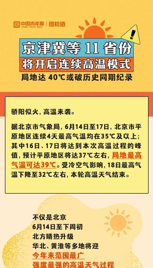 6月14日至下周初,華北、黃淮等多地將迎今年來(lái)范圍最廣、強(qiáng)度最強(qiáng)的高溫天氣過(guò)程,波及京津冀、山東、河南等11省份,河北、內(nèi)蒙古等部分地區(qū)將沖擊40℃,或打破歷史同期紀(jì)錄。全國(guó)總工會(huì)也發(fā)出提示,各級(jí)工會(huì)要督促用人單位提供必要的防護(hù)用品和高溫作業(yè)休息場(chǎng)所。為何這輪高溫這么猛?有哪些防范高溫天氣的建議?一起來(lái)看。