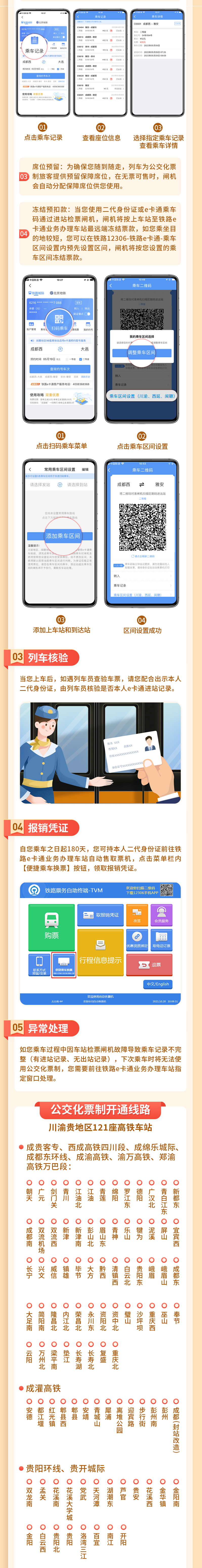為進(jìn)一步提升通勤旅客出行體驗(yàn),中國(guó)鐵路成都局集團(tuán)有限公司管內(nèi)的川渝貴地區(qū)121座高鐵車站啟用公交化票制。已開通鐵路e卡通的旅客在鐵路12306客戶端-鐵路e卡通主頁(yè),啟用刷證模式,即可使用二代身份證或e卡通乘車碼,實(shí)現(xiàn)無(wú)需購(gòu)票,刷證或掃碼即走。