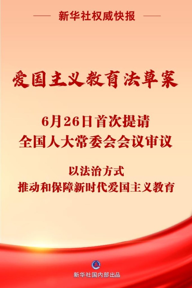 愛(ài)國(guó)主義教育法草案6月26日首次提請(qǐng)全國(guó)人大常委會(huì)會(huì)議審議。制定愛(ài)國(guó)主義教育法,以法治方式推動(dòng)和保障新時(shí)代愛(ài)國(guó)主義教育,對(duì)于振奮民族精神、凝聚人民力量,推進(jìn)強(qiáng)國(guó)建設(shè)、民族復(fù)興,具有十分重大而深遠(yuǎn)的意義。