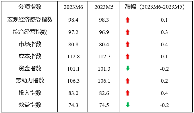 從分項指數(shù)看,6月份,8個分項指數(shù)6升2降,宏觀經(jīng)濟感受指數(shù)、市場指數(shù)、成本指數(shù)和投入指數(shù)止跌回升,綜合經(jīng)營指數(shù)由平轉(zhuǎn)升,勞動力指數(shù)連續(xù)兩個月上升,資金指數(shù)和效益指數(shù)由升或平轉(zhuǎn)降。