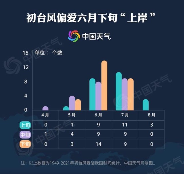 根據預報,這個熱帶系統(tǒng)或將于7月17日至18日左右在廣東到海南一帶沿海登陸。據中國天氣網大數據顯示,一般首個登陸我國的臺風多集中在每年的6月至7月,其中,6月下旬登陸的比例最高,7月上旬登陸比例位列第二。