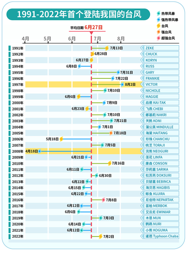 從統(tǒng)計數(shù)據(jù)可以看出,雖然今年初臺登陸我國時間明顯偏晚,但并不具有極端性。常年氣候平均監(jiān)測顯示(1991-2020年),首個登陸我國(包含港澳臺)的臺風(fēng)平均日期為6月27日,發(fā)生最多月份為6月(14個),其次為7月(13個),最早的首個登陸臺風(fēng)為2008年的1號臺風(fēng)浣熊(0801),登陸時間為4月18日,登陸地點在海南文昌。1997年臺風(fēng)“VICTOR”于8月2日登陸香港,是1991年以來最晚登陸我國的初臺。