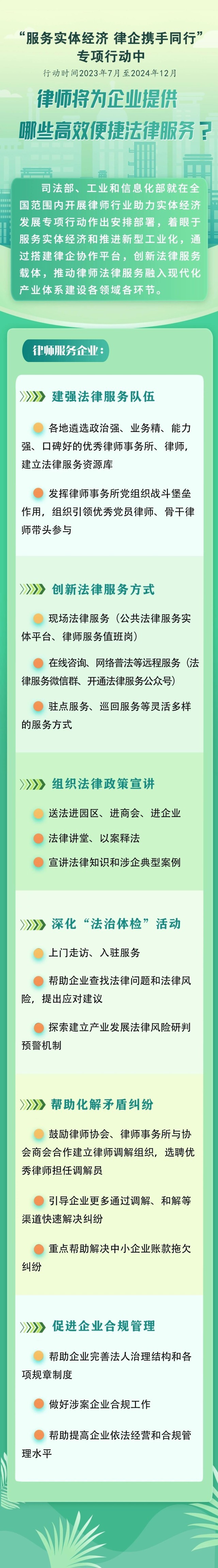 《方案》要求,各地司法行政部門、工業(yè)和信息化主管部門、通信管理局和律師協(xié)會要共同組織優(yōu)秀律師事務(wù)所和律師,為工業(yè)和信息化領(lǐng)域相關(guān)企業(yè)提供全業(yè)務(wù)、全時空、高效便捷的法律服務(wù)?;顒又?,要摸清各類企業(yè)法律服務(wù)需求,建強法律服務(wù)隊伍,創(chuàng)新法律服務(wù)方式,通過開展法律政策宣講、深化“法治體檢”活動等形式,推動律師行業(yè)服務(wù)實體經(jīng)濟的廣度和深度不斷拓展,服務(wù)的專業(yè)性、精準性、便捷性、實效性不斷增強,幫助企業(yè)化解法律風險,解決法律問題,維護合法權(quán)益,提升依法合規(guī)經(jīng)營管理水平。