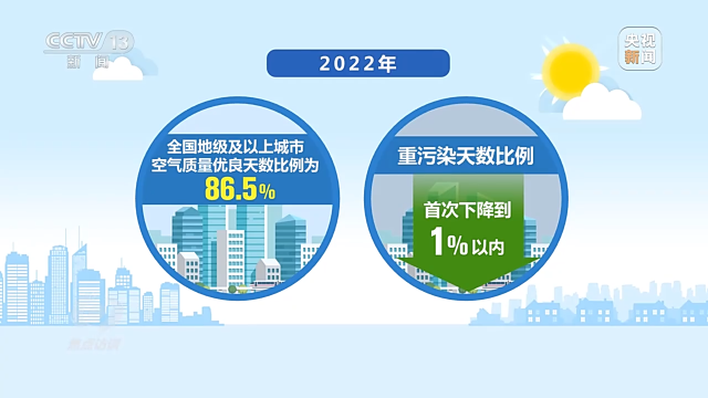 不僅北京,十年來,全國重點(diǎn)城市PM2.5平均濃度下降57%。2022年,全國地級(jí)及以上城市空氣質(zhì)量優(yōu)良天數(shù)比例為86.5%,重污染天數(shù)比例首次下降到1%以內(nèi)。我國成為全球大氣質(zhì)量改善速度最快的國家,藍(lán)天保衛(wèi)戰(zhàn)正在給百姓帶來實(shí)實(shí)在在的幸福感。