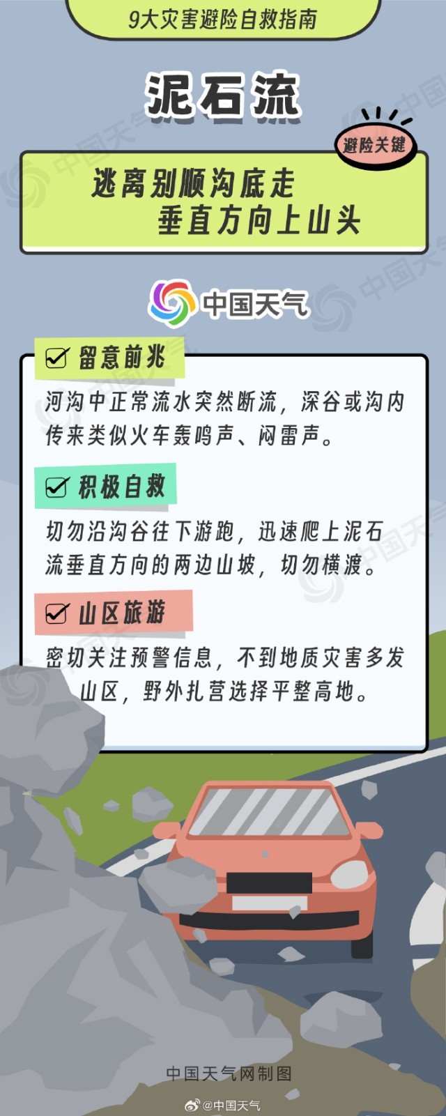 雨后山區(qū)道路沿線易發(fā)生落石,大家請(qǐng)避免在陡峭石壁或凸石下停留,當(dāng)災(zāi)害發(fā)生時(shí)要迅速向崩塌體兩側(cè)逃生;房前屋后土體突然鼓脹,局部出現(xiàn)滑塌或裂縫,并有水流滲出時(shí),要警惕滑坡災(zāi)害,快速向滑動(dòng)方向兩側(cè)逃離;地面出現(xiàn)環(huán)狀裂縫,地形下凹或地表水快速滲漏,建筑物出現(xiàn)傾斜開(kāi)裂時(shí),要迅速遠(yuǎn)離沉陷地帶。
