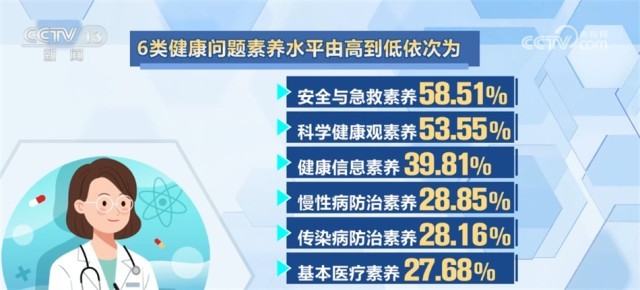 6類健康問題素養(yǎng)水平由高到低依次為:安全與急救素養(yǎng)58.51%、科學(xué)健康觀素養(yǎng)53.55%、健康信息素養(yǎng)39.81%、慢性病防治素養(yǎng)28.85%、傳染病防治素養(yǎng)28.16%和基本醫(yī)療素養(yǎng)27.68%。各類健康問題素養(yǎng)均有不同程度提升,其中,健康信息素養(yǎng)水平增幅最大,較2021年提升了3.88個(gè)百分點(diǎn)。本次監(jiān)測覆蓋31個(gè)省(自治區(qū)、直轄市)的336個(gè)縣(區(qū))1008個(gè)鄉(xiāng)鎮(zhèn)(街道),對象為15—69歲常住人口。
