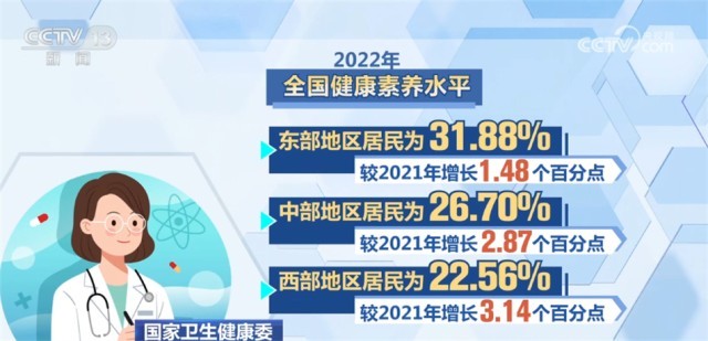 監(jiān)測結(jié)果顯示,2022年,全國城市居民健康素養(yǎng)水平為31.94%,農(nóng)村居民為23.78%,較2021年分別增長1.24和1.76個(gè)百分點(diǎn)。東、中、西部地區(qū)居民健康素養(yǎng)水平分別為31.88%、26.70%和22.56%,較2021年分別增長1.48、2.87和3.14個(gè)百分點(diǎn)。城鄉(xiāng)居民基本知識(shí)和理念素養(yǎng)水平為41.26%,健康生活方式與行為素養(yǎng)水平為30.63%,基本技能素養(yǎng)水平為26.00%,較2021年分別提升3.60、2.58、1.72個(gè)百分點(diǎn)。