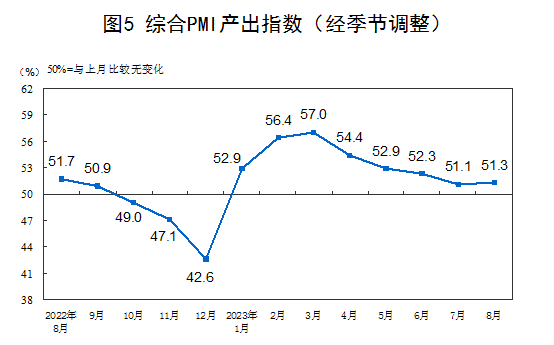 8月份,綜合PMI產出指數為51.3%,比上月上升0.2個百分點,繼續(xù)保持在擴張區(qū)間,表明我國企業(yè)生產經營活動總體穩(wěn)定擴張。