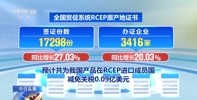 中國(guó)貿(mào)促會(huì)8月30日介紹:今年7月份,全國(guó)貿(mào)促系統(tǒng)累計(jì)簽發(fā)原產(chǎn)地證書等各類證書54.62萬(wàn)份,較上年同比增長(zhǎng)12.82%。全國(guó)貿(mào)促系統(tǒng)RCEP原產(chǎn)地證書簽證份數(shù)為17298份,同比增長(zhǎng)27.03%;辦證企業(yè)3416家,同比增長(zhǎng)20.03%,預(yù)計(jì)共為我國(guó)產(chǎn)品在RCEP進(jìn)口成員國(guó)減免關(guān)稅0.09億美元。