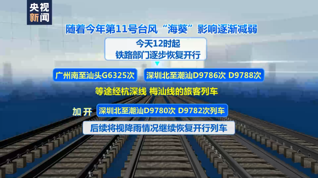 隨著今年第11號臺風“??庇绊懼饾u減弱,5日12時起,鐵路部門逐步恢復開行廣州南至汕頭G6325次、深圳北至潮汕D9786次、D9788次等途經杭深線、梅汕線的旅客列車,加開深圳北至潮汕D9780次、D9782次列車。后續(xù)將視降雨情況,繼續(xù)恢復開行列車。