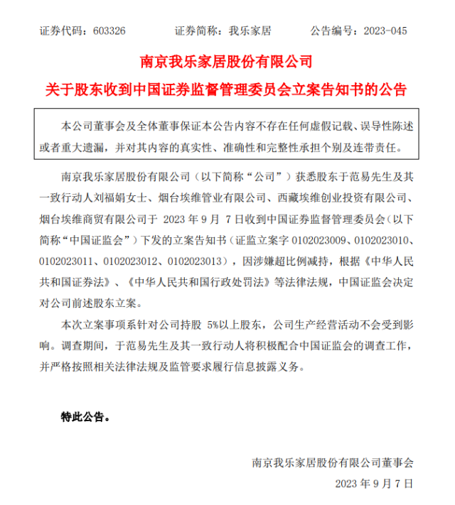 上市公司我樂家居今天(9月7日)公告,因涉嫌超比例減持,根據(jù)《中華人民共和國(guó)證券法》、《中華人民共和國(guó)行政處罰法》等法律法規(guī),中國(guó)證監(jiān)會(huì)決定對(duì)公司相關(guān)股東立案。