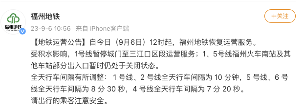 央視網(wǎng)消息:據(jù)@福州地鐵 消息,自今日(9月6日)12時起,福州地鐵恢復運營服務。