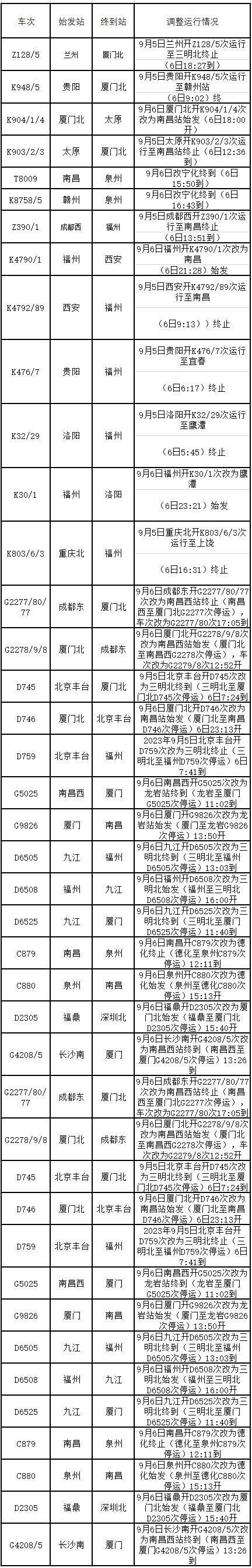 受臺(tái)風(fēng)“海葵”殘余環(huán)流影響,預(yù)計(jì)9月6日8時(shí)至7日8時(shí),福建東部和南部、江西南部等地有大到暴雨,其中福建東南部沿海部分地區(qū)有大暴雨,局地有雷暴大風(fēng)等強(qiáng)對(duì)流天氣。為確保人民生命財(cái)產(chǎn)安全和鐵路運(yùn)輸安全,中國(guó)鐵路南昌局集團(tuán)有限公司(以下簡(jiǎn)稱南鐵)調(diào)整9月6日、7日部分旅客列車運(yùn)行方案(具體見附件)。