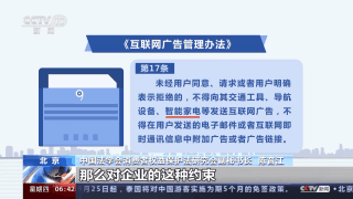 中國法學會消費者權益保護法研究會副秘書長 陳音江:廣告法里面規(guī)定得就比較粗一些,任何單位或個人,你沒有經(jīng)過當事人的同意,不能夠向這種住宅或者說交通設施上去投放廣告,但是用的是“等”,就沒有這么具體。修訂實施的《互聯(lián)網(wǎng)廣告管理辦法》里面,它就明確地說了包括智能家電,你沒有經(jīng)過同意,你也不能夠往它里面去發(fā)送這種廣告。這幾年,針對智能家電的這種廣告它的規(guī)定越來越具體,那么對企業(yè)的這種約束也應該是越來越具體,或者說它這種合規(guī)的紅線越來越明確。