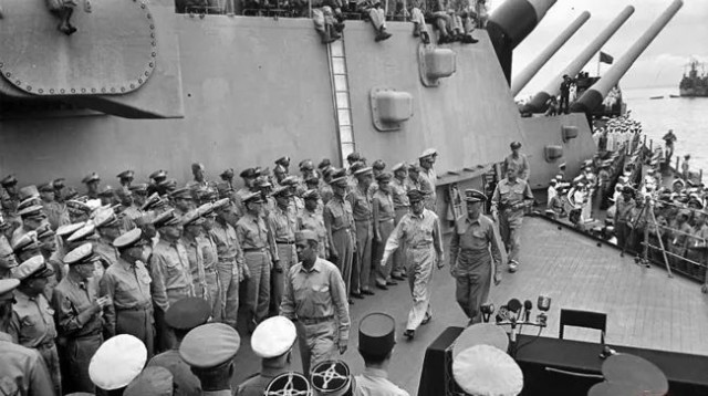 停泊于東京灣的美國(guó)戰(zhàn)列艦“密蘇里”號(hào)上舉行向同盟國(guó)投降的簽降儀式
