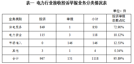 電力行業(yè)排在首位,數(shù)量為1118件、占投訴舉報總數(shù)的95.89%,主要集中在供電服務(wù)、市場準(zhǔn)入、電力安全等方面。