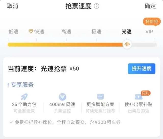 此外,許多第三方平臺推出搶票加速服務。例如,某平臺實行階梯服務及價位,速度從快速、高速、極速、光速到VIP,分別提供5-40個“助力包”,網(wǎng)速為200-500m/s,價格從10-80元不等,平臺會贈送助力包,也可通過邀請好友獲取。該平臺還推出專人搶票功能,使用該功能可以24小時不間斷、通過更多渠道搶票,提高搶票成功率,價格為30元。此外,搶靠窗、過道的位置需另外加價。