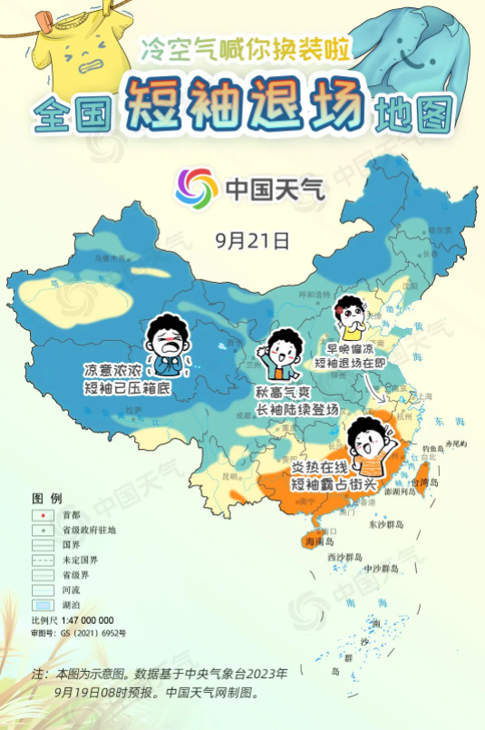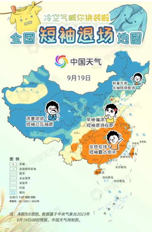 進入9月中旬,冷空氣變“勞?!鳖l繁來襲,西北、東北大部都已邁入秋天門檻,但華北一帶今年秋天似乎來得有點兒晚,南方地區(qū)白天甚至熱到還要開空調(diào),不少網(wǎng)友喊話:“秋高氣爽何時能來?”9月19日至21日,受冷空氣和降雨共同影響,長江以北大部地區(qū)將陸續(xù)迎來降溫,開啟秋日初體驗。中國天氣網(wǎng)特別推出全國短袖退場地圖,看看哪里可以安排秋天的第一件長袖。