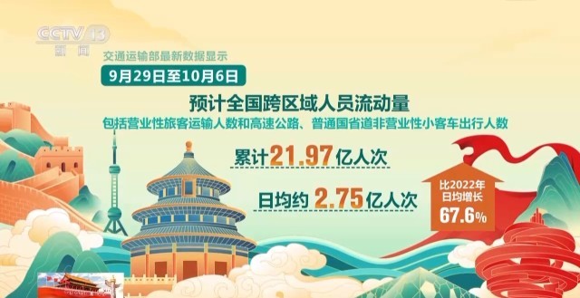 交通運(yùn)輸部最新數(shù)據(jù)顯示,9月29日至10月6日預(yù)計(jì)全國(guó)跨區(qū)域人員流動(dòng)量(包括營(yíng)業(yè)性旅客運(yùn)輸人數(shù)和高速公路、普通國(guó)省道非營(yíng)業(yè)性小客車出行人數(shù))累計(jì)21.97億人次,日均約2.75億人次,比2022年日均增長(zhǎng)67.6%。