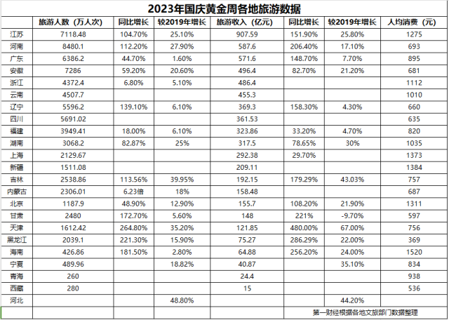 第一財(cái)經(jīng)梳理發(fā)現(xiàn),今年五一假期,在旅游人數(shù)超過3000萬人次的旅游大省中,跟疫情前相比僅云南人均消費(fèi)出現(xiàn)增長(zhǎng),包括河南、四川、廣東、江蘇和浙江的人均消費(fèi)相比2019年“五一”節(jié)都是下降的。但是,今年國(guó)慶期間,多數(shù)省份旅游收入的增幅高于旅游人數(shù)的增幅。