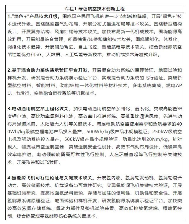 1.強化綠色航空關(guān)鍵核心技術(shù)攻關(guān)。持續(xù)推動總體、氣動、結(jié)構(gòu)、發(fā)動機、機載、材料、制造工藝等領(lǐng)域技術(shù)升級換代,加速發(fā)展混合動力推進系統(tǒng),不斷提升干支線飛機、通用航空器節(jié)能減排降噪水平。加快發(fā)展高能量密度、高放電效率、高安全性的航空動力電池技術(shù),以及高可靠性、高功重比、高效率的航空電推進技術(shù)。加強高效燃?xì)鉁u輪-電能融合技術(shù)研究。引導(dǎo)優(yōu)勢企業(yè)和研究機構(gòu)持續(xù)突破智能化、高可靠性、輕量化、低成本能量控制和飛行控制技術(shù),開展新能源飛機總體設(shè)計、能源系統(tǒng)設(shè)計、全電機載系統(tǒng)等技術(shù)攻關(guān)。持續(xù)探索氫燃料存儲技術(shù)、氫燃料電池技術(shù)、氫內(nèi)燃、氫渦輪發(fā)動機技術(shù)、氫渦輪混合電推進技術(shù)、能量綜合管理技術(shù)等氫能源飛機關(guān)鍵技術(shù)。面向國家綠色航空發(fā)展的戰(zhàn)略需要,加快布局基礎(chǔ)研究和應(yīng)用基礎(chǔ)研究,解決制約綠色航空發(fā)展的源頭和底層技術(shù)問題。