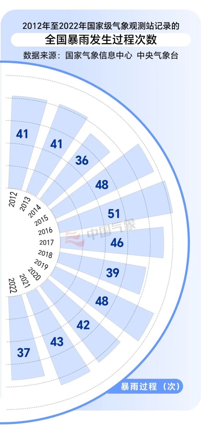 我們通過(guò)數(shù)據(jù)了解下我國(guó)近年來(lái)的暴雨發(fā)生頻次。2012年至2022年間,我國(guó)共發(fā)生暴雨天氣過(guò)程472次,年均發(fā)生次數(shù)約為42.9次;2016年暴雨發(fā)生次數(shù)最多,為51次;2014年最少,為36次(2023年未結(jié)束,暫不計(jì))。