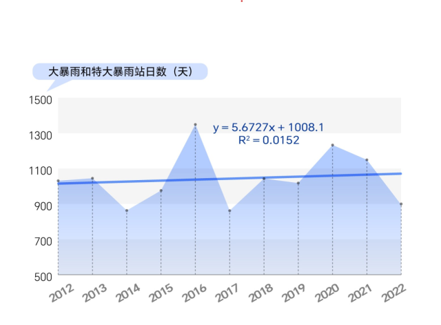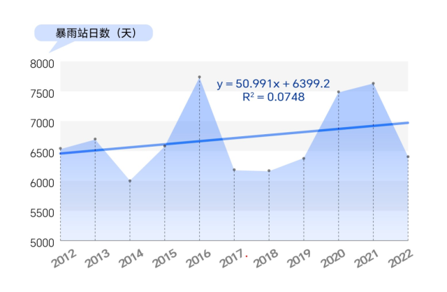 數(shù)據(jù)統(tǒng)計(jì)顯示,2012年至2022年,我國(guó)暴雨站日數(shù)有明顯的增加趨勢(shì)。這意味著,2012年到2022年,我國(guó)暴雨天氣過(guò)程的持續(xù)時(shí)間或影響范圍有增加(擴(kuò)大)的趨勢(shì)。