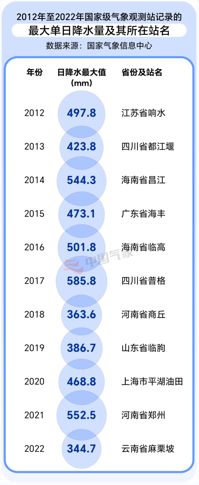 那么,近年來(lái)的單日最大降水量又是如何變化的呢?據(jù)國(guó)家氣象信息中心數(shù)據(jù)顯示,2012年至2022年,我國(guó)日降水量最大值分別出現(xiàn)在江蘇響水、四川都江堰、海南昌江、廣東海豐、海南臨高、四川普格、山東臨朐、上海平湖油田、河南鄭州、云南麻栗坡。