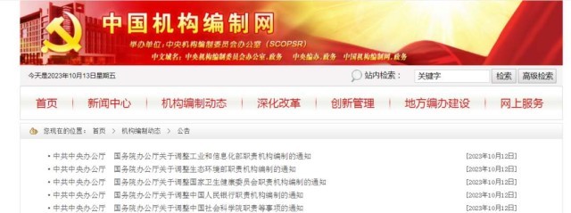 中國機構(gòu)編制網(wǎng)12日消息,中共中央辦公廳、國務(wù)院辦公廳日前發(fā)布相關(guān)通知,調(diào)整工業(yè)和信息化部、生態(tài)環(huán)境部、國家衛(wèi)生健康委員會、中國人民銀行職責(zé)機構(gòu)編制,調(diào)整中國社會科學(xué)院職責(zé)等事項。