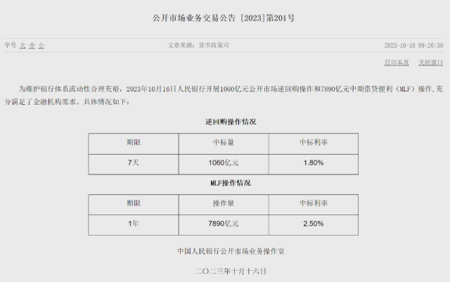 為維護(hù)銀行體系流動(dòng)性合理充裕,10月16日中國(guó)人民銀行開(kāi)展1060億元公開(kāi)市場(chǎng)逆回購(gòu)操作和7890億元中期借貸便利(MLF)操作,充分滿足了金融機(jī)構(gòu)需求。