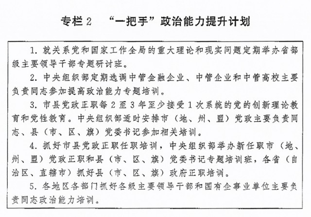 ?。ǘ┩怀觥瓣P(guān)鍵少數(shù)”政治訓(xùn)練。堅(jiān)持把政治訓(xùn)練貫穿干部成長(zhǎng)全周期,使干部的政治素養(yǎng)、政治能力與擔(dān)負(fù)的領(lǐng)導(dǎo)職責(zé)相匹配。強(qiáng)化“一把手”政治培訓(xùn),有計(jì)劃地選調(diào)地方、部門、國(guó)有企事業(yè)單位主要負(fù)責(zé)同志到黨校(行政學(xué)院)、干部學(xué)院參加專題培訓(xùn)。實(shí)施“一把手”政治能力提升計(jì)劃(專欄2)。?。ㄗ灾螀^(qū)、直轄市)、市(地、州、盟)、縣(市、區(qū)、旗)黨政領(lǐng)導(dǎo)班子成員每2至3年到黨校(行政學(xué)院)、干部學(xué)院至少接受1次系統(tǒng)的黨的創(chuàng)新理論教育和黨性教育,5年內(nèi)累計(jì)不少于2個(gè)月。圍繞提高政治能力和領(lǐng)導(dǎo)能力,加強(qiáng)機(jī)關(guān)司局長(zhǎng)、處長(zhǎng)任職培訓(xùn)。重視對(duì)女干部、少數(shù)民族干部、黨外干部等的政治培訓(xùn)。加強(qiáng)對(duì)高層次人才的政治引領(lǐng),中央組織部會(huì)同有關(guān)單位每年組織一定數(shù)量人才開展國(guó)情研修。
