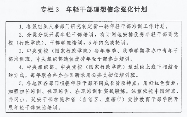?。ㄈ┘訌?qiáng)年輕干部政治訓(xùn)練。強(qiáng)化習(xí)近平新時(shí)代中國(guó)特色社會(huì)主義思想學(xué)習(xí)教育,突出政治忠誠(chéng)教育、理想信念教育、紀(jì)律規(guī)矩教育,加強(qiáng)優(yōu)良傳統(tǒng)作風(fēng)和責(zé)任感使命感教育,強(qiáng)化斗爭(zhēng)意識(shí),綜合運(yùn)用理論講授、政策解讀、案例教學(xué)、現(xiàn)場(chǎng)體驗(yàn)等方式開展系統(tǒng)培訓(xùn)。黨委(黨組)負(fù)責(zé)同志要講好“開班第一課”。安排思想政治素質(zhì)過硬、理論水平較高、實(shí)踐經(jīng)驗(yàn)豐富的領(lǐng)導(dǎo)干部上講臺(tái)授課。探索推行“政治輔導(dǎo)員”、“導(dǎo)師幫帶”制度。通過開展黨性分析、實(shí)踐鍛煉、過“政治生日”、重溫入黨誓詞等方式,錘煉黨性修養(yǎng)、提高政治覺悟。實(shí)施年輕干部理想信念強(qiáng)化計(jì)劃(專欄3)。