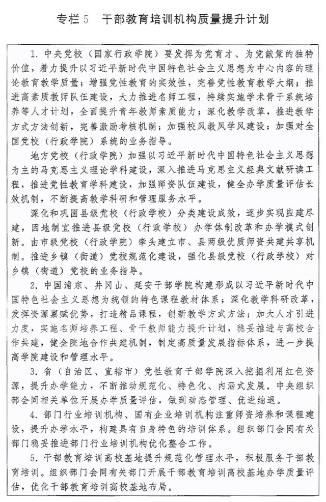 ?。ㄒ唬┡嘤?xùn)機(jī)構(gòu)建設(shè)。推進(jìn)各級(jí)黨校(行政學(xué)院)建設(shè),以教學(xué)督導(dǎo)、師資培養(yǎng)、質(zhì)量評(píng)估為重點(diǎn),強(qiáng)化上級(jí)黨校(行政學(xué)院)對(duì)下級(jí)黨校(行政學(xué)院)的業(yè)務(wù)指導(dǎo),不斷提高辦學(xué)水平。推進(jìn)縣級(jí)黨校(行政學(xué)校)分類建設(shè)。加強(qiáng)社會(huì)主義學(xué)院建設(shè)。進(jìn)一步提升部門行業(yè)培訓(xùn)機(jī)構(gòu)、國(guó)有企業(yè)培訓(xùn)機(jī)構(gòu)辦學(xué)質(zhì)量。加強(qiáng)對(duì)干部教育培訓(xùn)高校基地、基層干部教育培訓(xùn)機(jī)構(gòu)辦學(xué)指導(dǎo)。開展黨校(行政學(xué)院)、省(自治區(qū)、直轄市)黨性教育干部學(xué)院、干部教育培訓(xùn)高?;剞k學(xué)質(zhì)量評(píng)估。加強(qiáng)各類黨員干部教育培訓(xùn)機(jī)構(gòu)規(guī)范管理,嚴(yán)控新設(shè)以黨員干部為培訓(xùn)對(duì)象的培訓(xùn)機(jī)構(gòu)。支持地方、部門聯(lián)合開展培訓(xùn),鼓勵(lì)干部教育培訓(xùn)機(jī)構(gòu)開展區(qū)域協(xié)作交流,推動(dòng)優(yōu)質(zhì)培訓(xùn)資源共享。實(shí)施干部教育培訓(xùn)機(jī)構(gòu)質(zhì)量提升計(jì)劃(專欄5)。