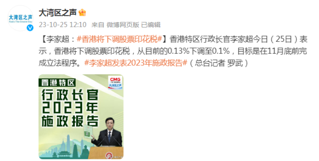 香港特區(qū)行政長(zhǎng)官李家超今日(25日)表示,香港將下調(diào)股票印花稅,從目前的0.13%下調(diào)至0.1%,目標(biāo)是在11月底前完成立法程序。(總臺(tái)記者 羅武)