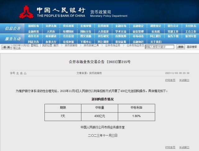 據(jù)央行官網(wǎng)消息,為維護(hù)銀行體系流動(dòng)性合理充裕,2023年11月3日中國(guó)人民銀行以利率招標(biāo)方式開(kāi)展了430億元逆回購(gòu)操作。具體情況如下:
