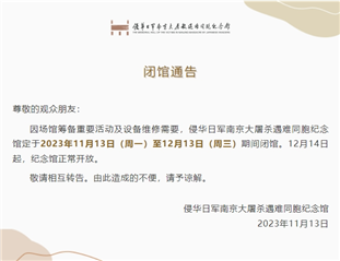 記者從侵華日軍南京大屠殺遇難同胞紀念館了解到,因場館籌備重要活動及設備維修需要,該館定于2023年11月13日(周一)至12月13日(周三)期間閉館,12月14日起正常開放。