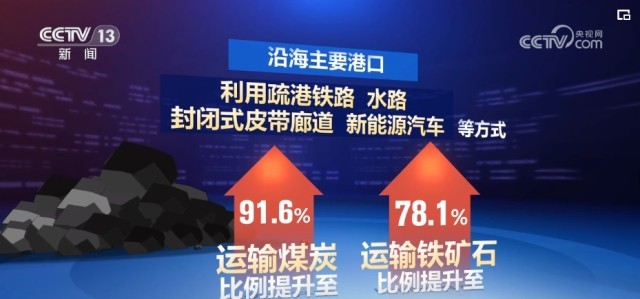 貨物“公轉(zhuǎn)鐵”“公轉(zhuǎn)水”深入推進,沿海主要港口利用疏港鐵路、水路、封閉式皮帶廊道、新能源汽車等方式運輸煤炭、鐵礦石的比例提升至91.6%和78.1%。