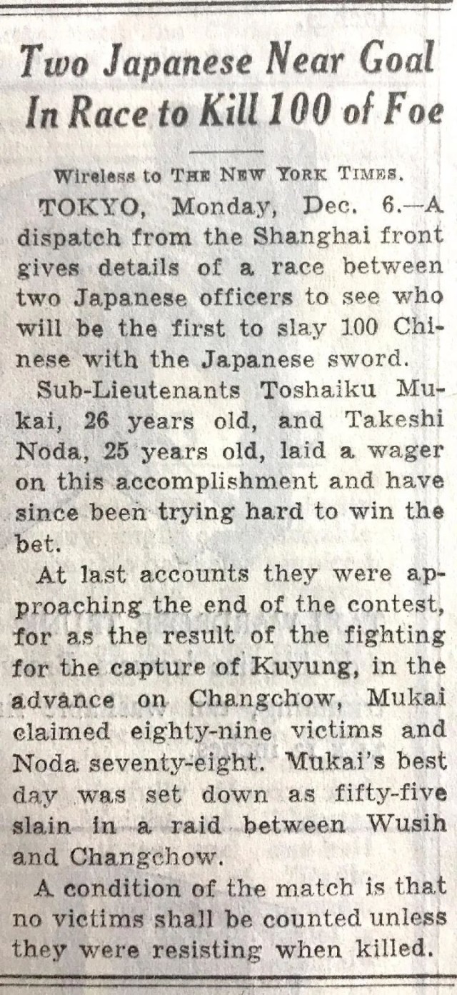 在1937年12月6日發(fā)行的《紐約時報》中,也登載了有關(guān)日軍“百人斬”殺人競賽的報道。報道稱,來自上海前線的一份電報詳細介紹了兩名日本軍官之間的一場比賽,看誰先殺死100名中國人。年紀分別為25歲和26歲的日本軍官把賭注壓在了這項“成就”上。