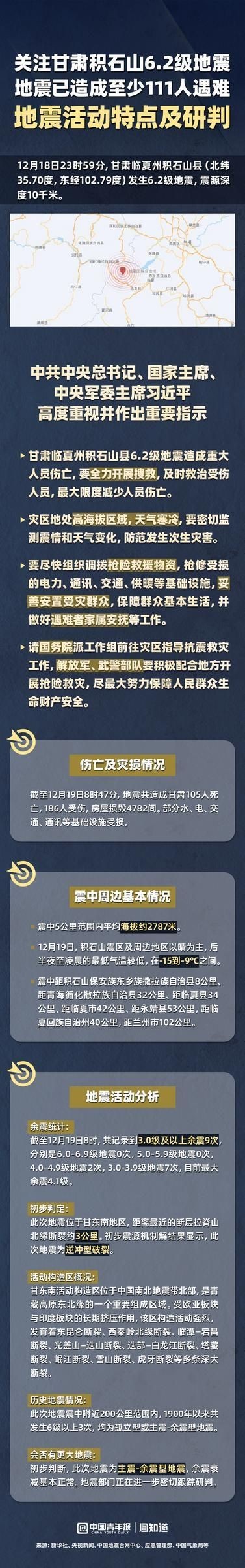 地震專家表示余震衰減基本正常,甘肅積石山6.2級(jí)地震救援正在緊張進(jìn)行中。截至12月19日8時(shí),共記錄到3.0級(jí)及以上余震9次。這次地震有何特點(diǎn)?周邊基本海拔、溫度情況如何?歷史上發(fā)生過(guò)哪些地震?是否會(huì)有更大的地震出現(xiàn)?中國(guó)地震臺(tái)網(wǎng)中心專家作出初步研判。
