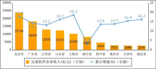 主要軟件大省收入占比持續(xù)提升。1—11月份,軟件業(yè)務(wù)收入居前5名的省份中,北京市,廣東省,江蘇省,山東省,上海市軟件收入分別為23756億元、18190億元、12920億元、12315億元和10184億元,分別增長(zhǎng)17.8%、14.2%、13.2%、16.2%和18.5%,五?。ㄊ校┖嫌?jì)軟件業(yè)務(wù)收入77365億元,占全國(guó)比重為70%,占比較去年同期提高1.2個(gè)百分點(diǎn)。